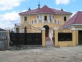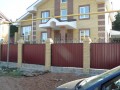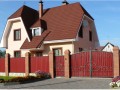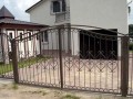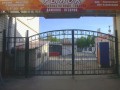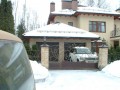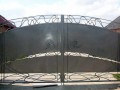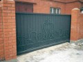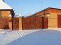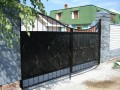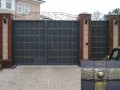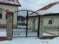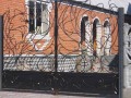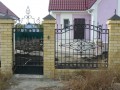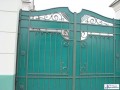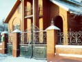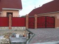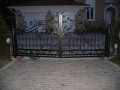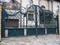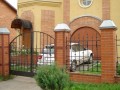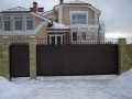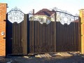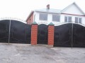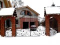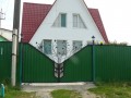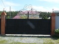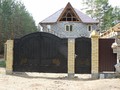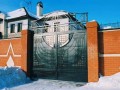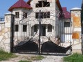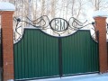 Распашные кованые ворота фото . Являются визитной карточкой дома, выделяясь на общем сером фоне яркими деталями проработанного и прокованного экстерьера ворот.